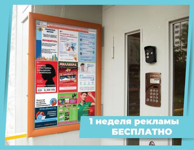 Проект «Московское информационное Пространство», объединяющий в единую информационную площадку стенды, установленные на подъездах жилых домов в Западном округе и оператор проекта ГК "Чистый Город" в качестве меры поддержки предприятий, предоставляющих услуги и товары населению, выделят дополнительные места на стендах под недельное бесплатное размещение.