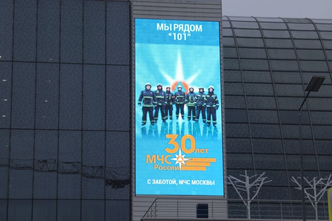 На 18 медиафасадах столицы в течение дня транслируются видеоролики, посвященные 30-летию со дня основания МЧС России. Специальный проект посвящен пожарным столичного управления МЧС России, которые по первому зову приходят на помощь людям, встают на борьбу со стихией, преодолевают последствия катастроф. Многие из них даже в свой праздник будут нести боевую вахту на страже безопасности москвичей и гостей столицы.