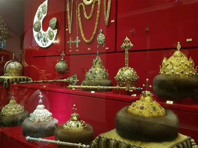 В числе экспонатов — царские троны, подаренные Русскому двору и декорированные золотыми пластинками, самоцветами и драгоценными камнями. Внимание посетителей также привлекли царские кареты: они отличаются изысканной деревянной резьбой, но уступают в техническом исполнении.