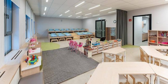 Учреждение вмещает 150 детей. В интерьере, в основном, использовались оттенки серого, оливкового и белого.