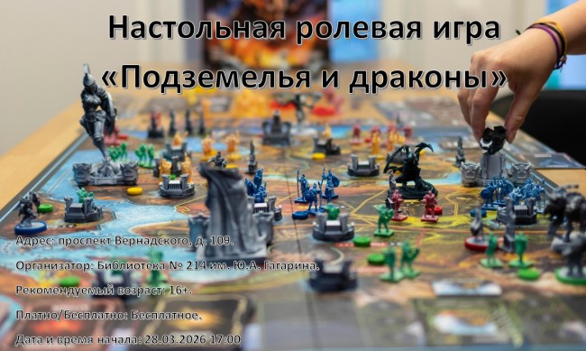 28 марта в 17:00 библиотека №214 имени Ю.А. Гагарина организует настольную ролевую игру «Подземелья и драконы». Событие состоится по адресу: проспект Вернадского, д. 109. Участие бесплатное, рекомендуемый возраст посетителей от 16 лет.
