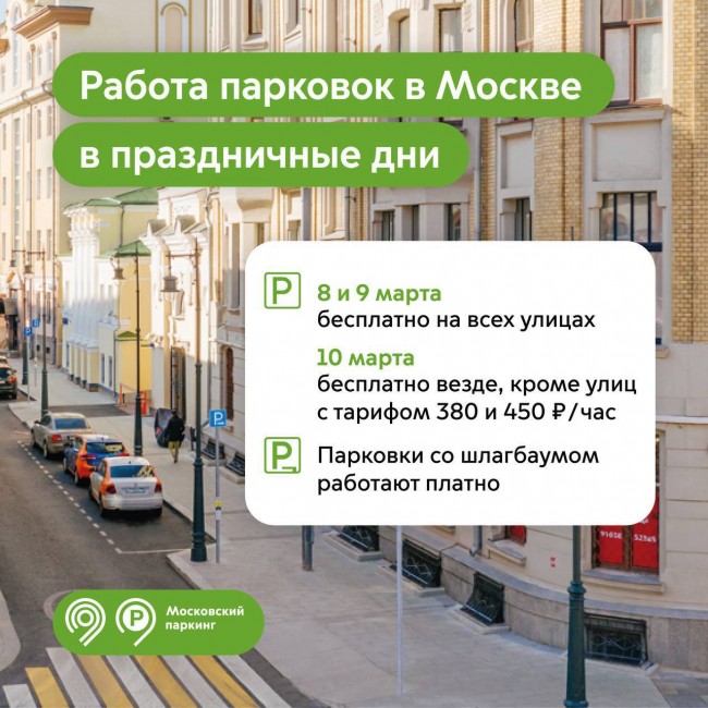 «По решению Мэра Москвы Сергея Собянина уличные парковки традиционно станут бесплатными для автомобилистов в праздничные дни — 8 и 9 марта. Это не повлияет на загруженность улиц и парковок, потому что число машин на дорогах в это время снижается. Просим водителей быть внимательными и парковаться по правилам», — отметил Максим Ликсутов.